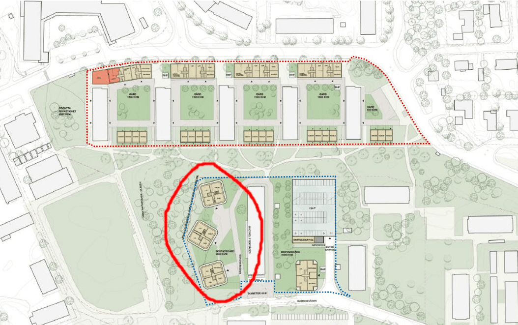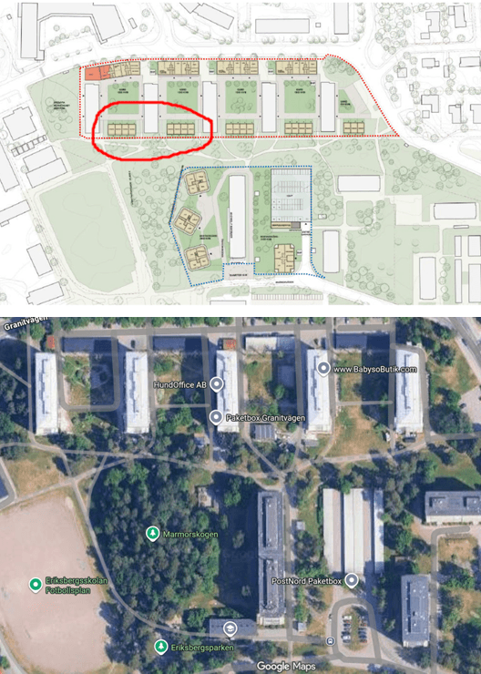 Vi vill även uppmana kommunen att inte uppföra radhusen enligt figur nedan då dessa platser idag utgör en mikroskog med krontäckning.